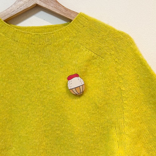 大盛りのごはんの上にぷりぷり明太子が乗っているわんぱくモチーフのかわいい木製ブローチです。