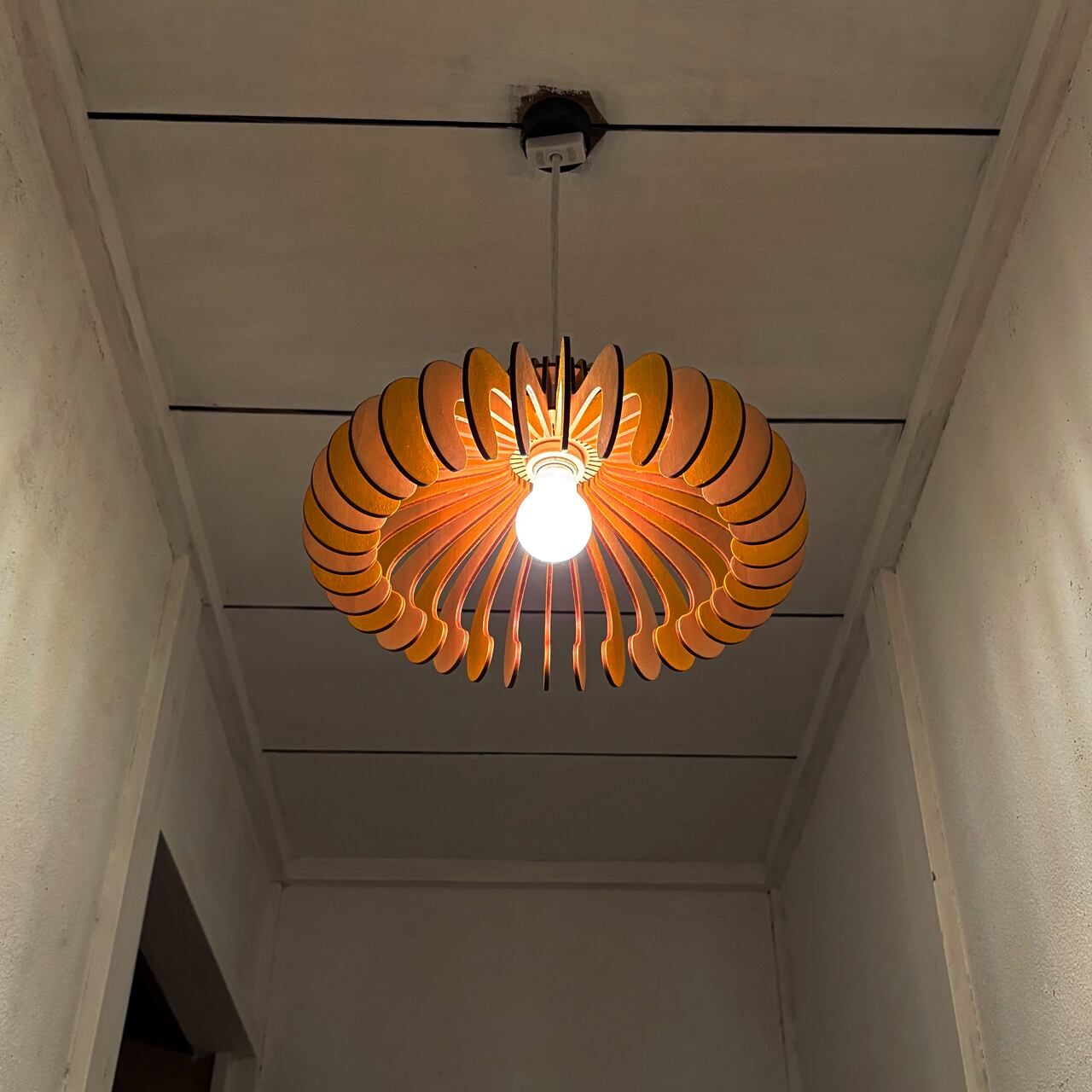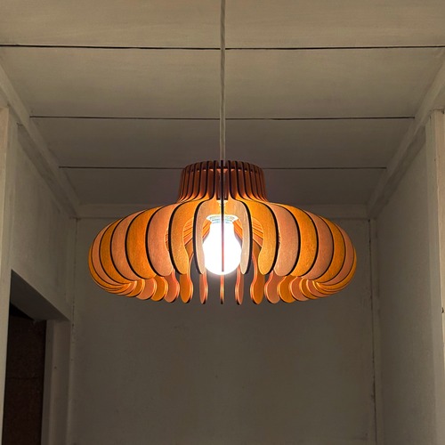 大きめの木製シェードが、空間にやわらかな空気感と落ち着きを添えてくれます。