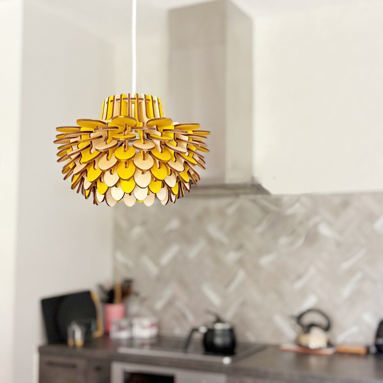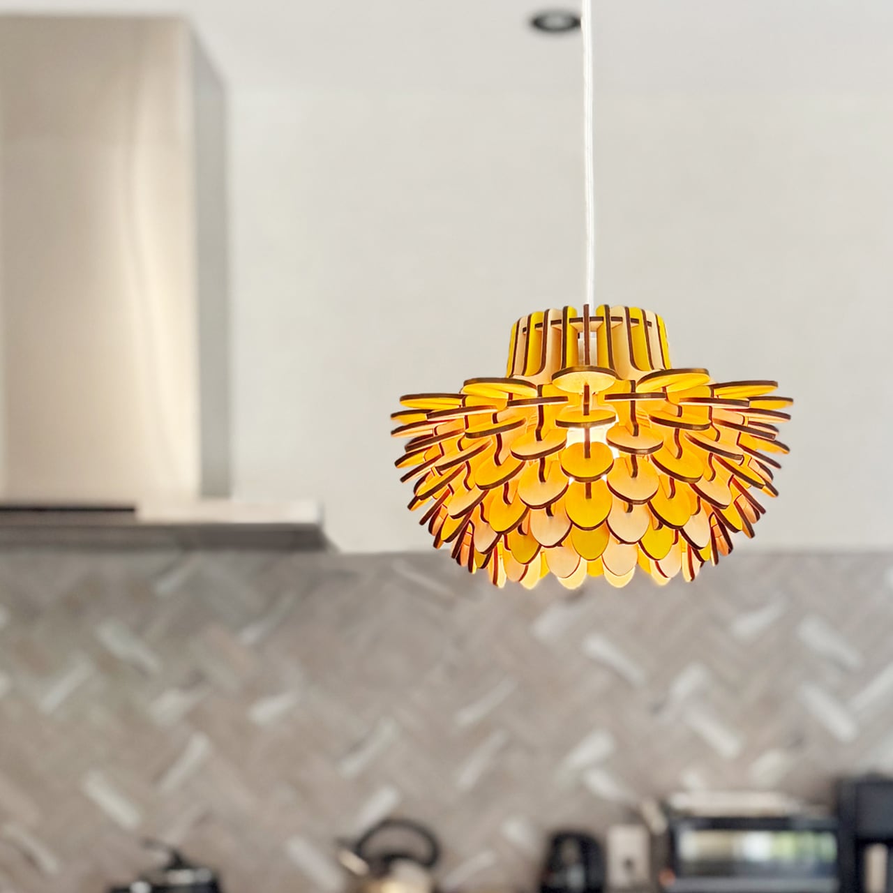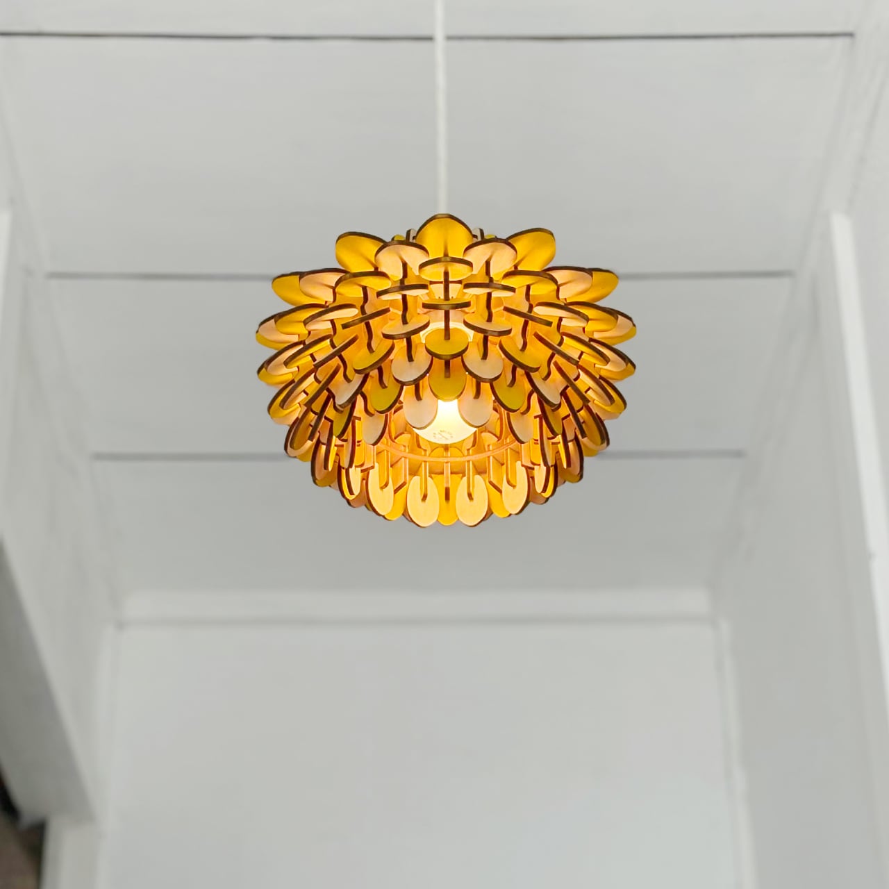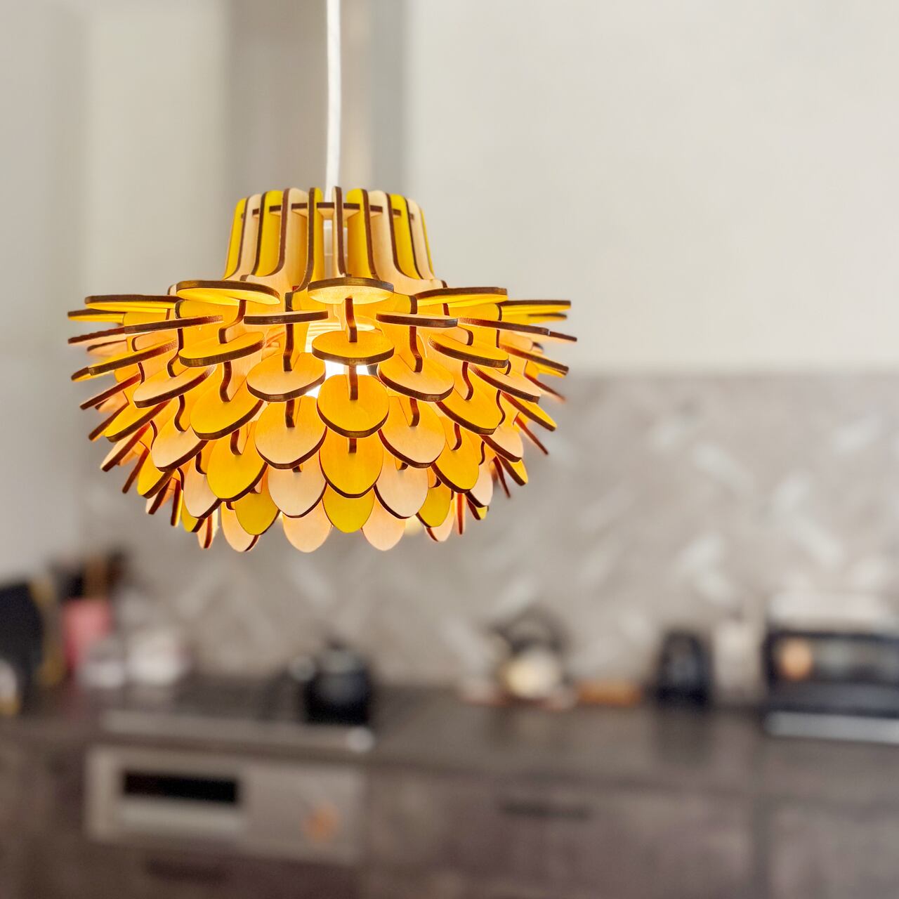 木製ペンダントライト 『ダリア(ミモザイエロー)』 |北欧ナチュラル照明|花びらデザイン|華やかで存在感ある灯り|おしゃれな木の天井照明