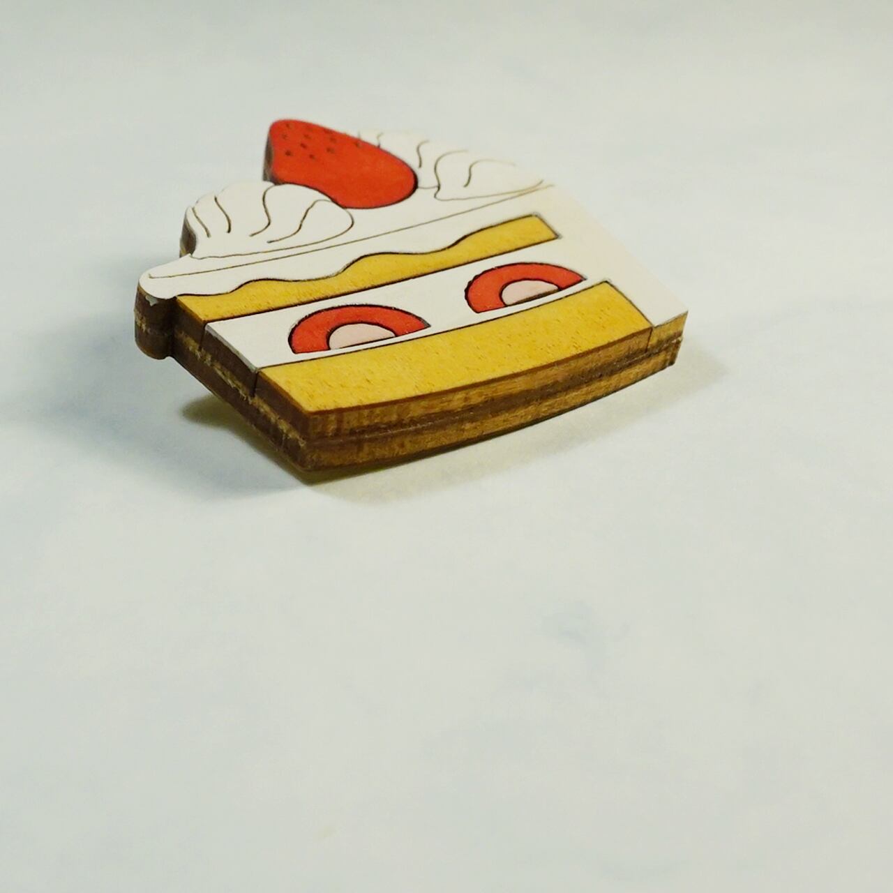 「ショートケーキ」をモチーフにしたぬくもりを感じさせるかわいい木製ブローチです。